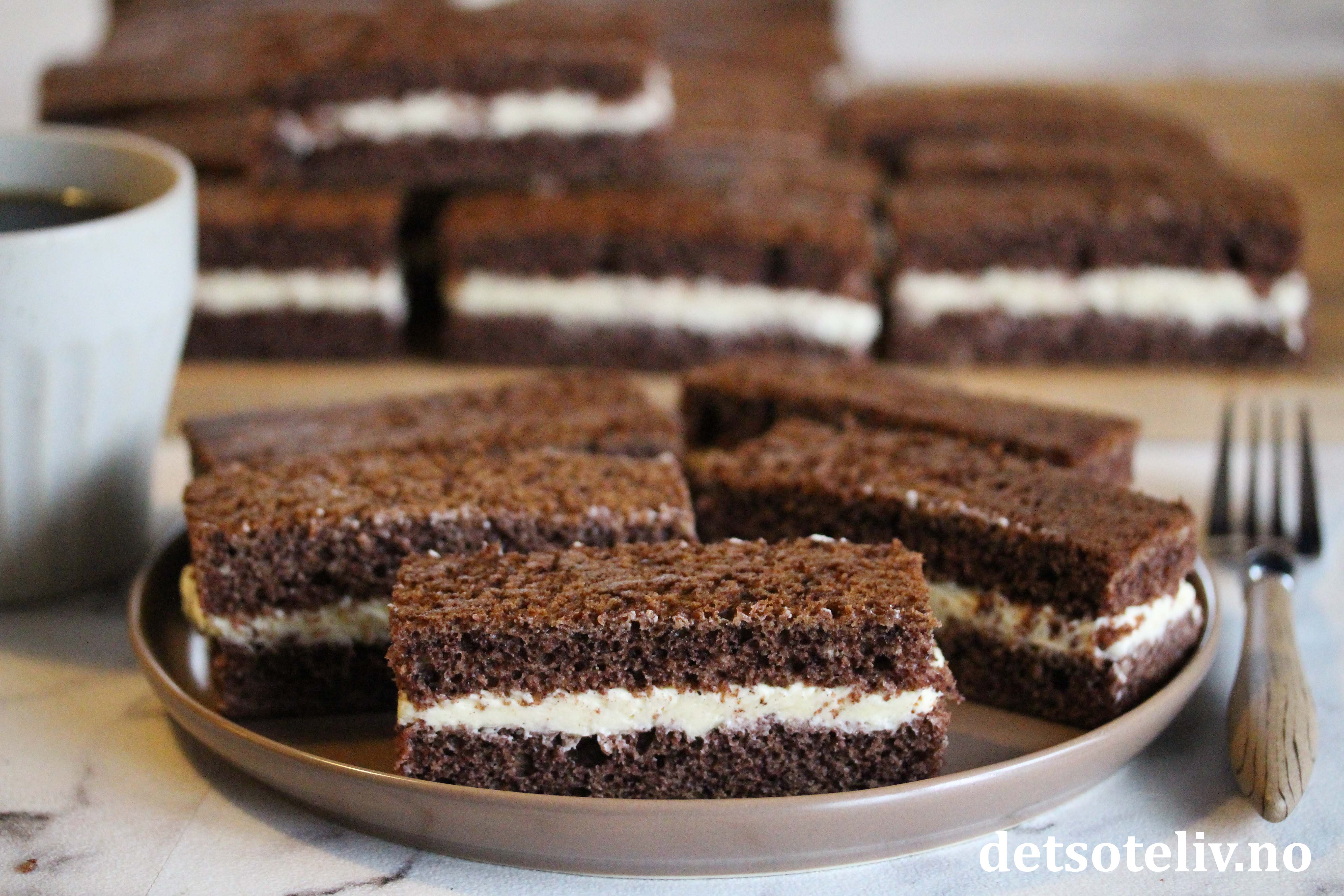 Mormorkake er en kjempegod sjokoladekake, som serveres i snitter fylt med smørkrem.
