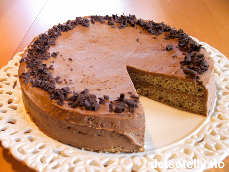 Smelt smøret og bland med revet kokesjokolade, melis og kaffe. Rør i glasuren til den er jevn og klumpfri. Fyll kaken med ca halvparten av sjokoladekremen. Bruk resten av kremen til å dekke kaken. Pynt kaken eventuelt med høvlet sjokolade til slutt.