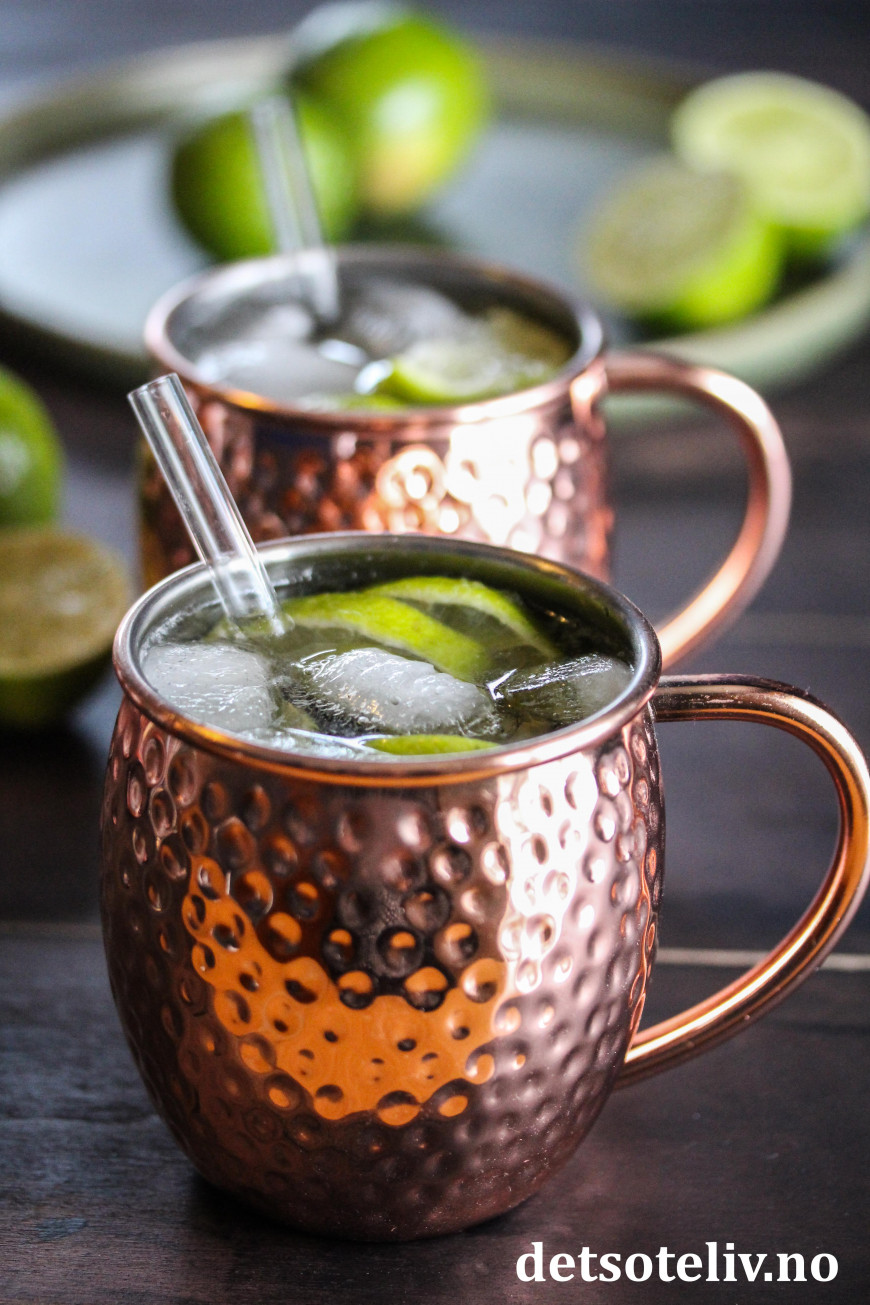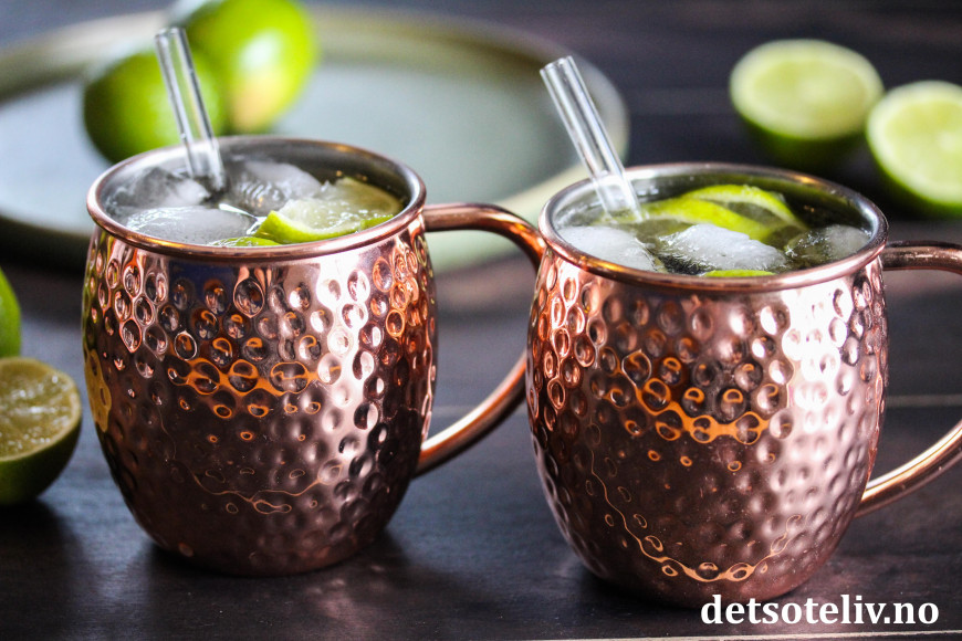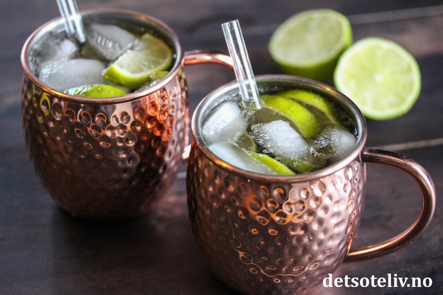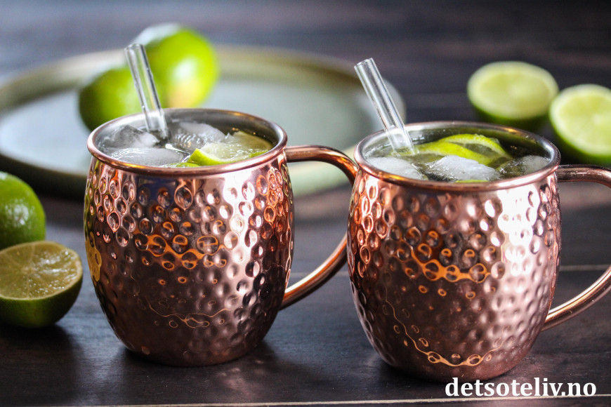 Moscow Mule er en populær drink som inneholder vodka, ingefærøl og lime. Drinken skal helst serveres i karakteristiske kobberkrus, som du ser på bildet, hvilket gjør at drinken holder seg kald lengre.