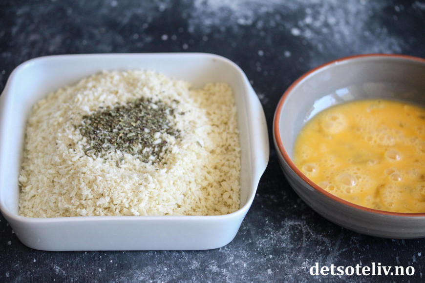 I en annen, flat og vid skål blandes panko med salt og tørket basilikum og/eller oregano.
