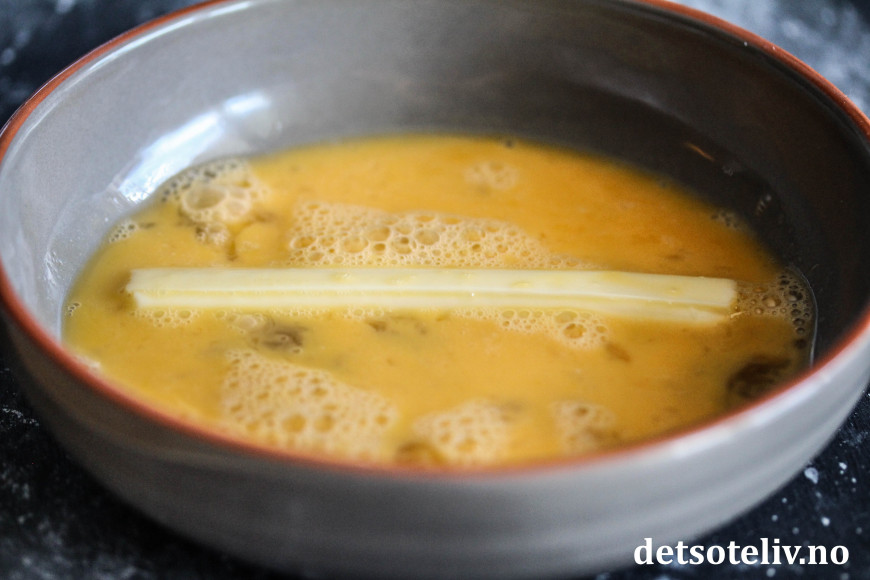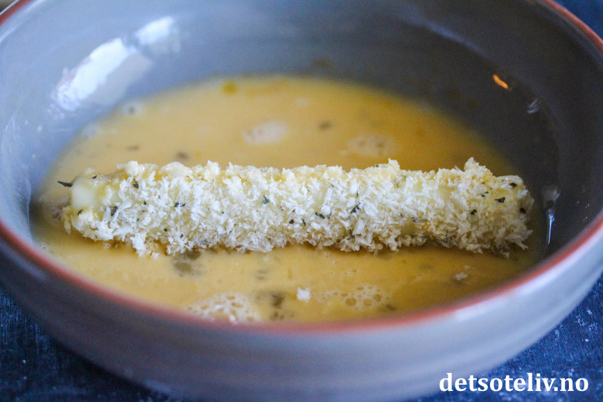 Gjenta så prosessen med å dyppe hver panerte ostestang igjen i egg og deretter i panko-brødsmuler.
