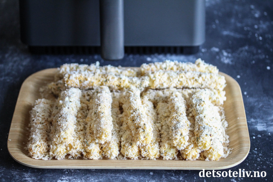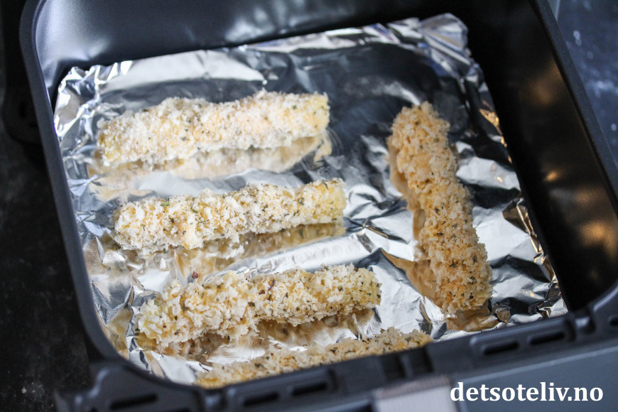 Merk at ostestengene ikke skal tine før stekingen, men hentes rett fra fryseren før de legges på folien i airfryeren.