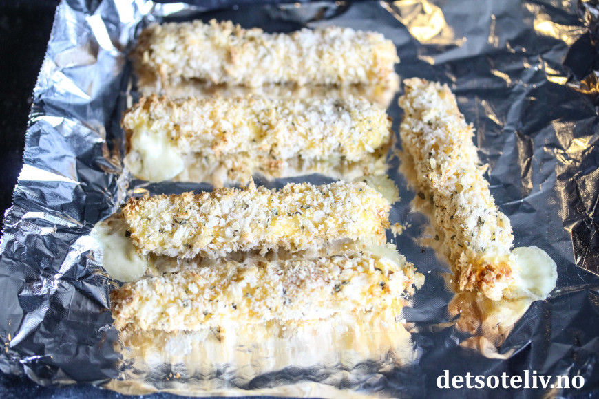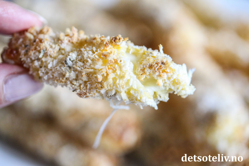 ♥ Bruk mozzarella ostestenger med fettinnhold, ellers vil stengene kunne få en gummiaktig konsistens. Jeg synes det ble veldig vellykket å bruke disse mozzarella-stengene.