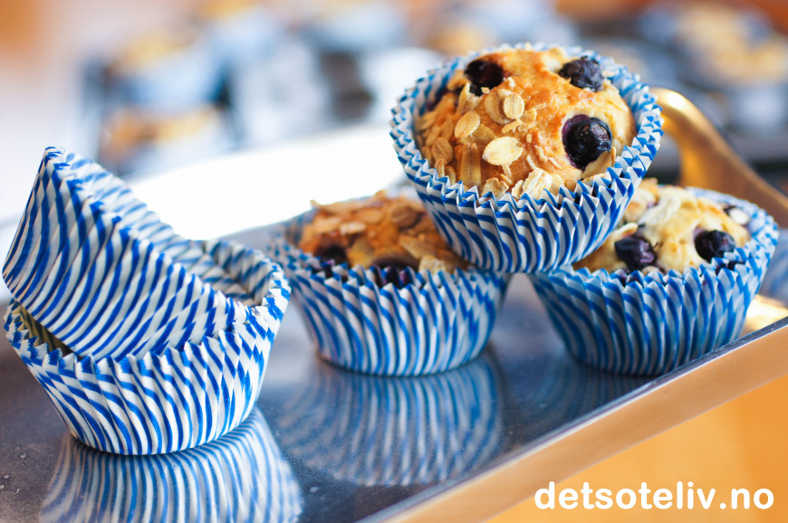 ♥ Det er lekkert å ha noen blåbær oppå muffinsene før steking, som da vil synes på toppen av de stekte muffinsene.