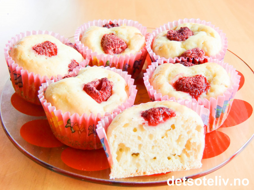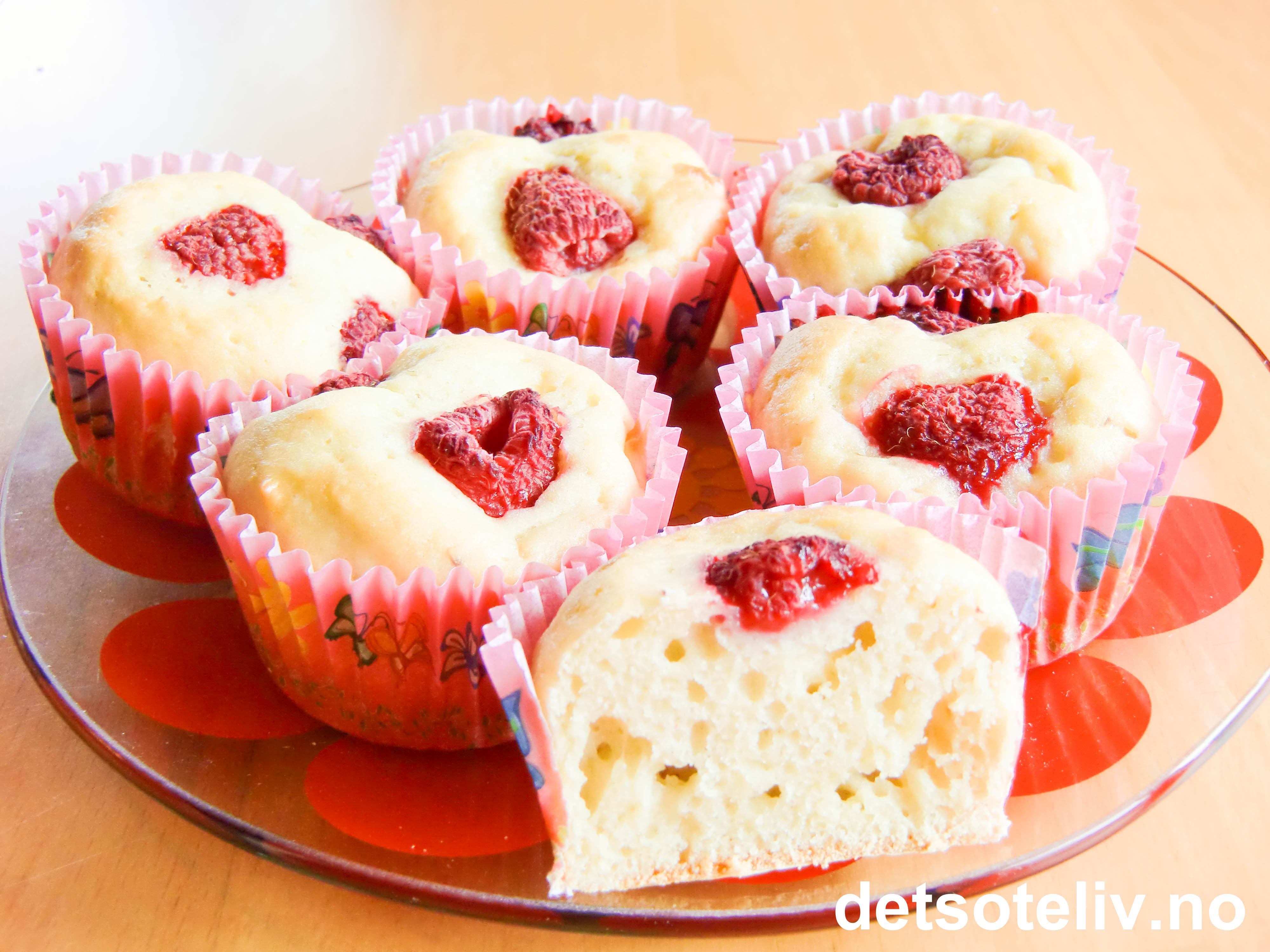 Ha papirformer i muffinsbrett og fordel deigen i formene. Legg noen bær på toppen.