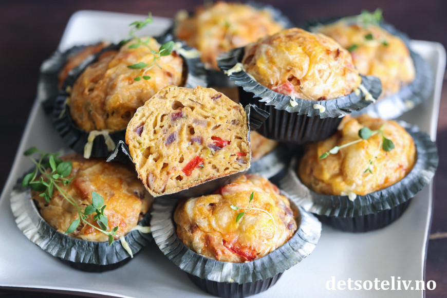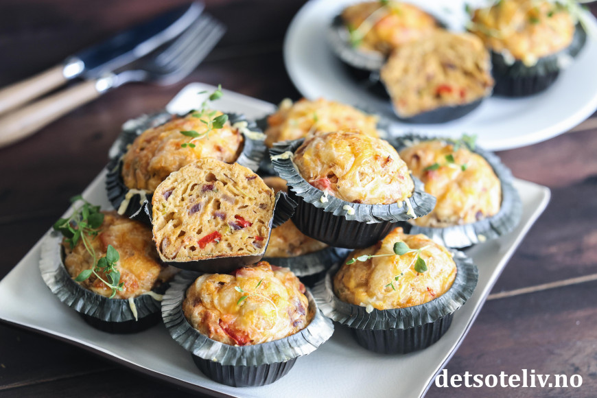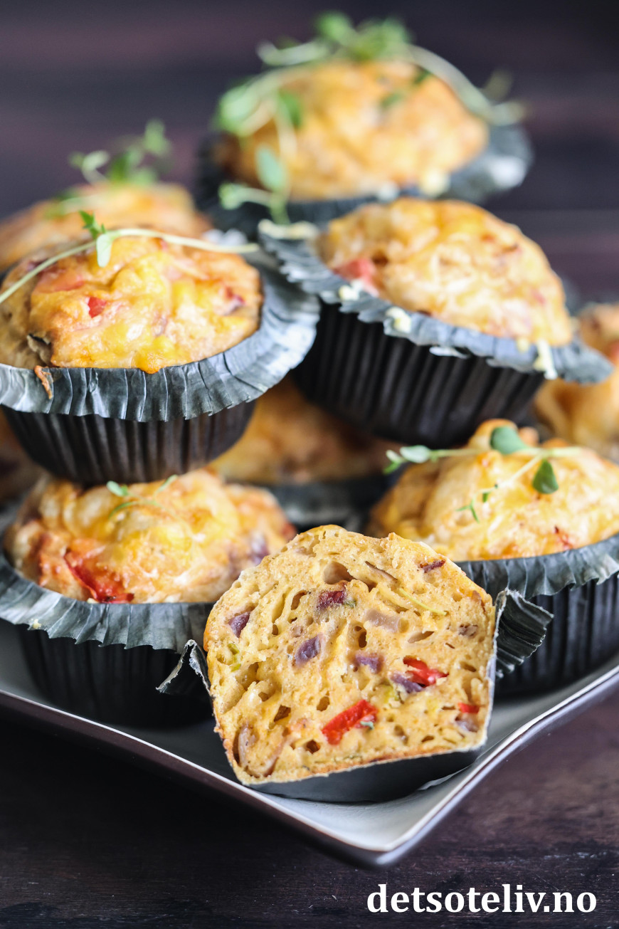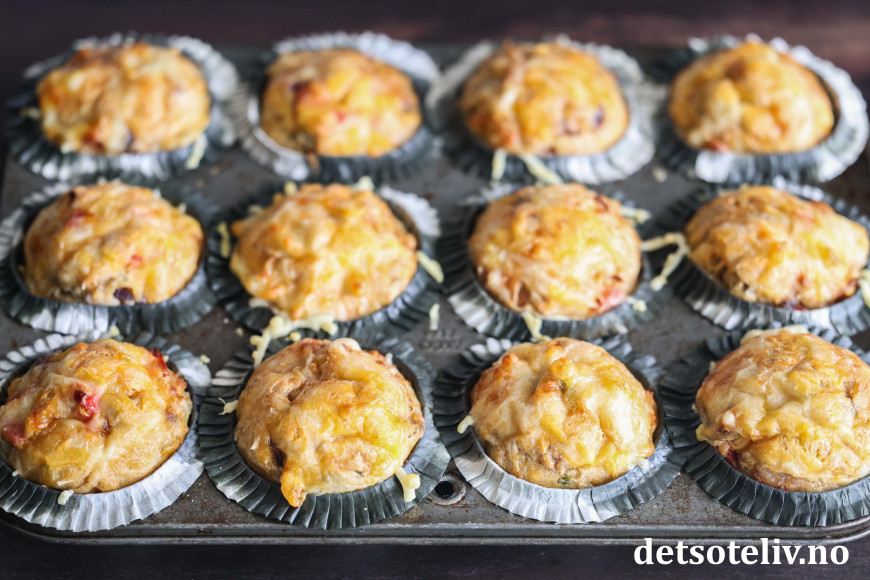 Se også populære Muffins med ost og skinke, Pizzamuffins og Matmuffins med ost, tomat og oliven.