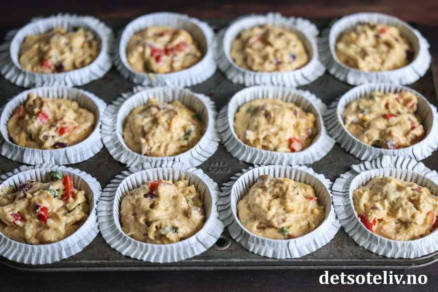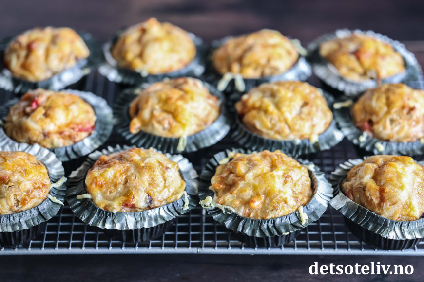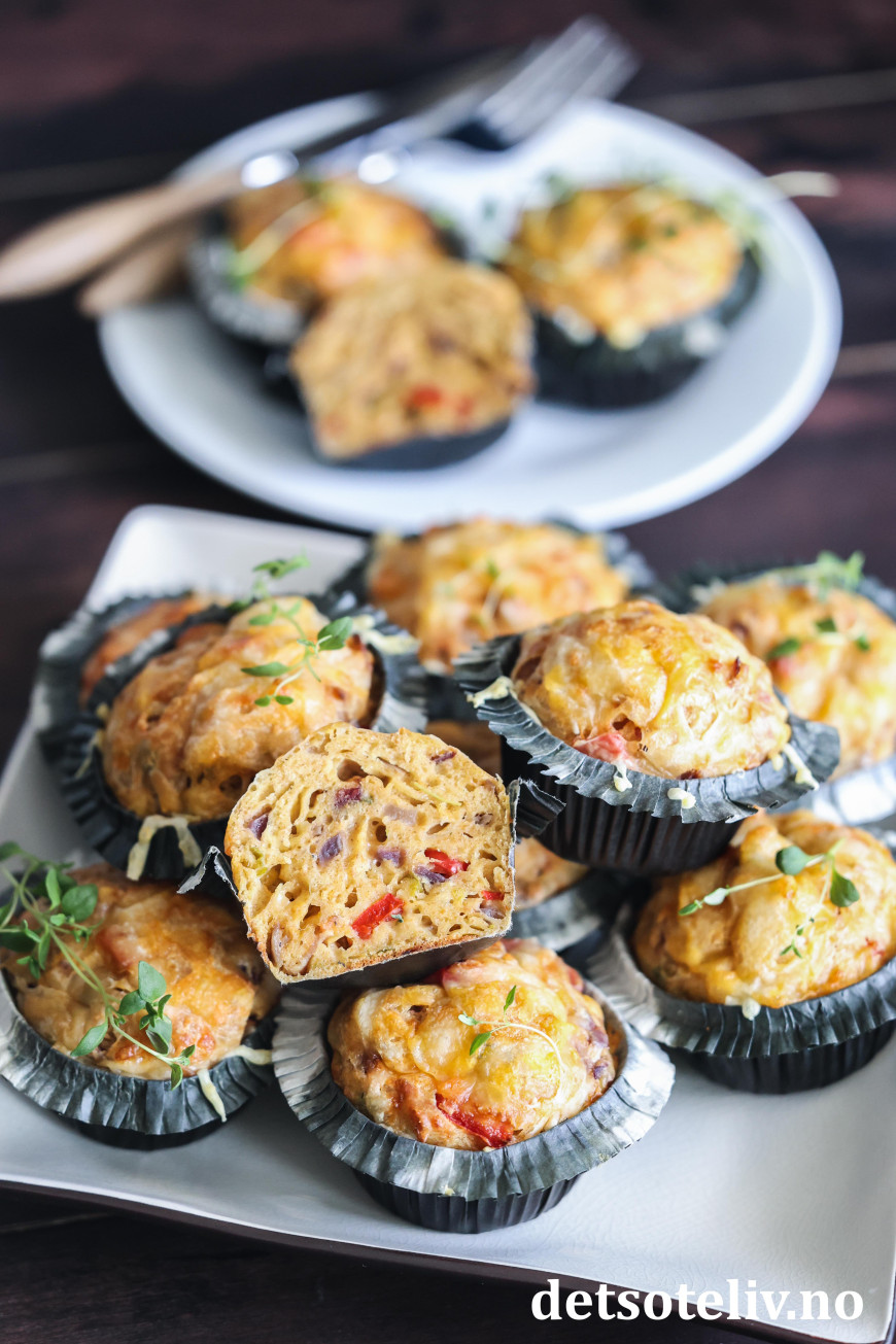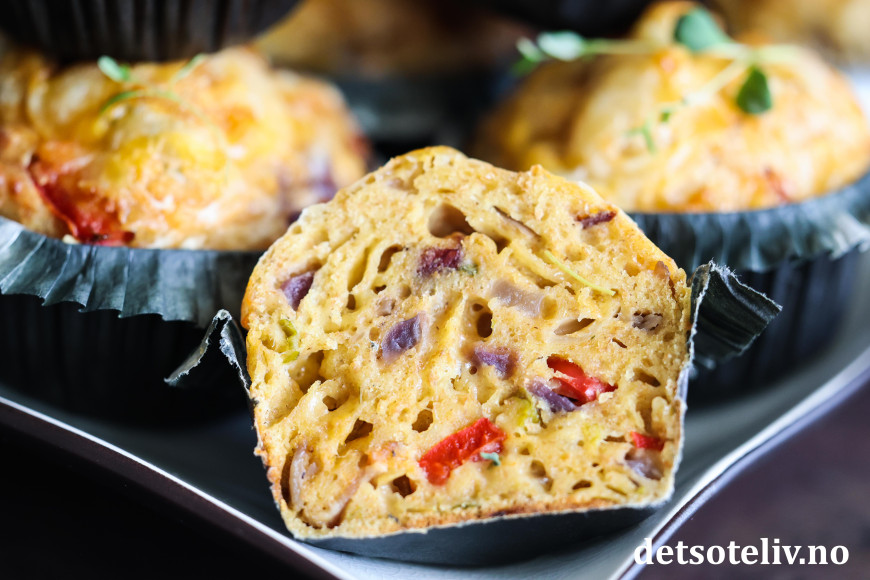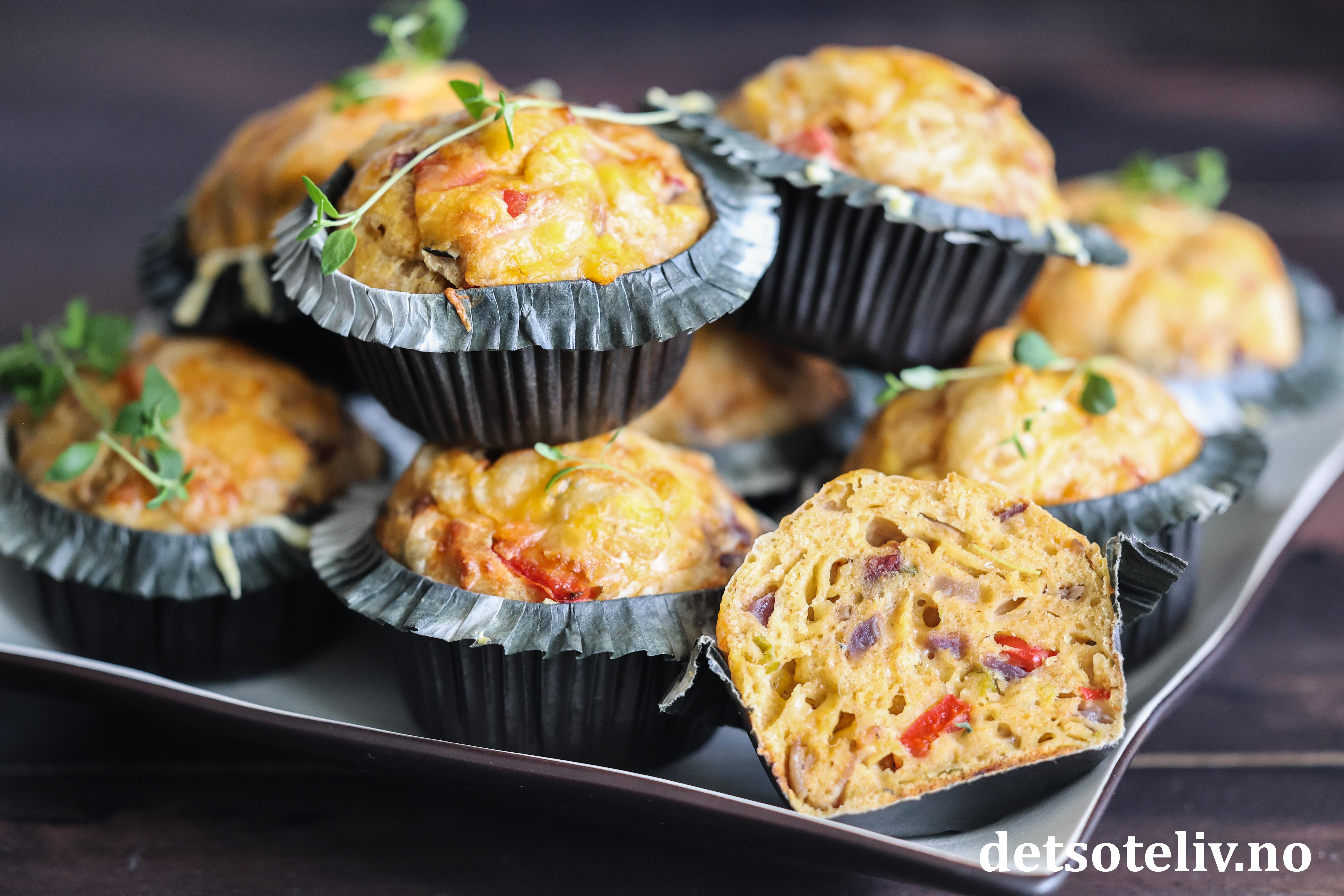 Se også populære Muffins med ost og skinke, Pizzamuffins og Matmuffins med ost, tomat og oliven.