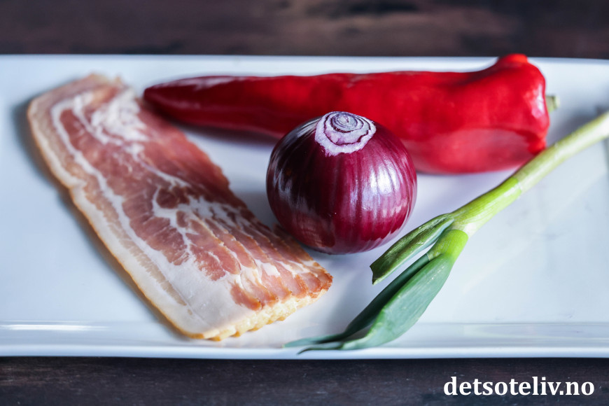 Finn frem bacon, rødløk, paprika og vårløk.