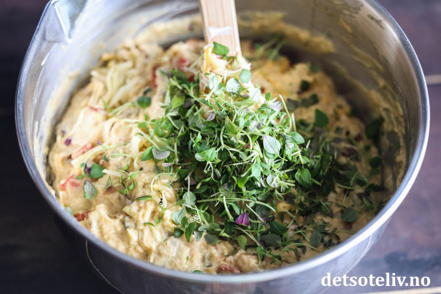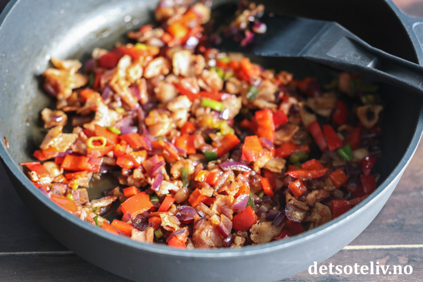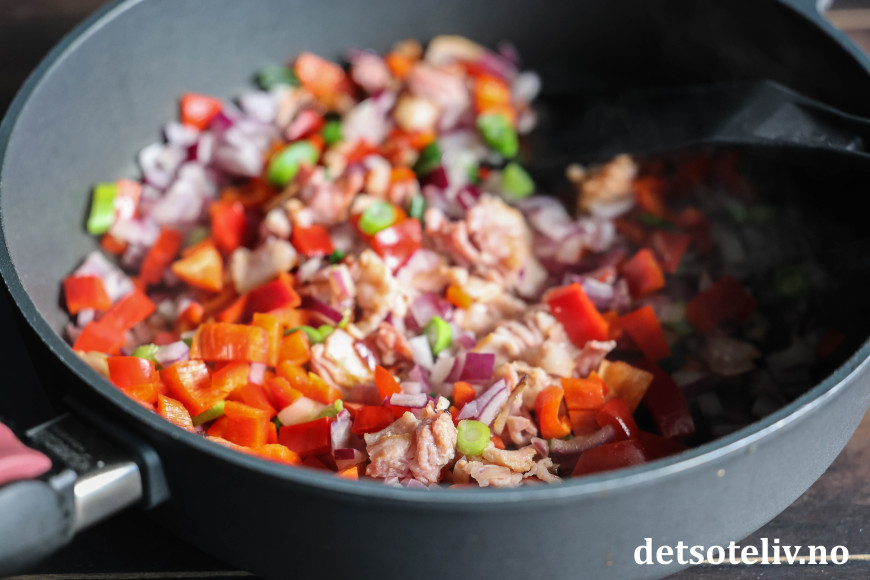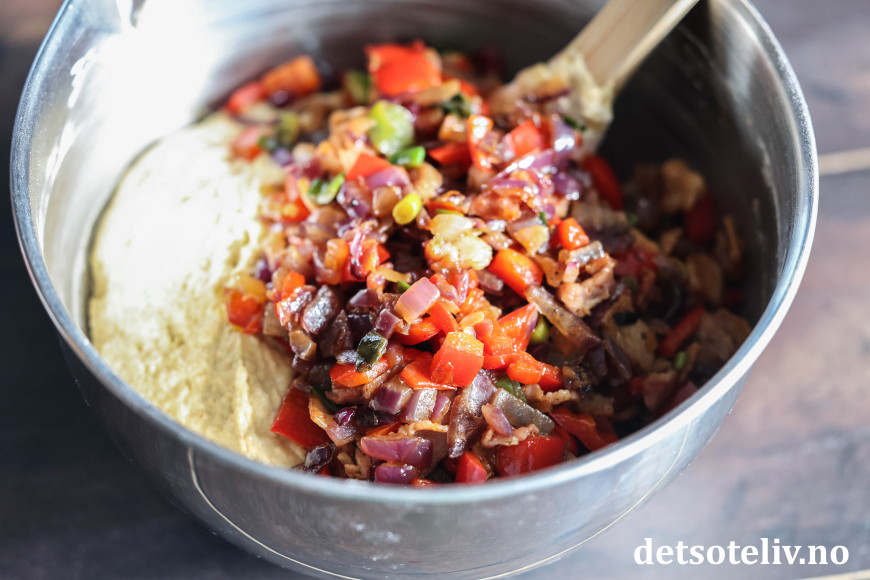 Finn frem bacon, rødløk, paprika og vårløk. Kutt dette i mindre biter og ha i en stekepanne (ha eventuelt også litt ekstra olivenolje i pannen). Stekes på middels varme til løken er blank, myk og gyllen. Avkjøl og vend dette forsiktig inn i deigen.