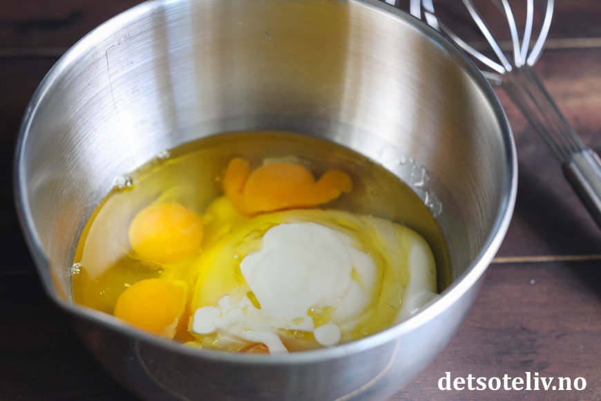 Ha egg, olivenolje og yoghurt i en bolle.