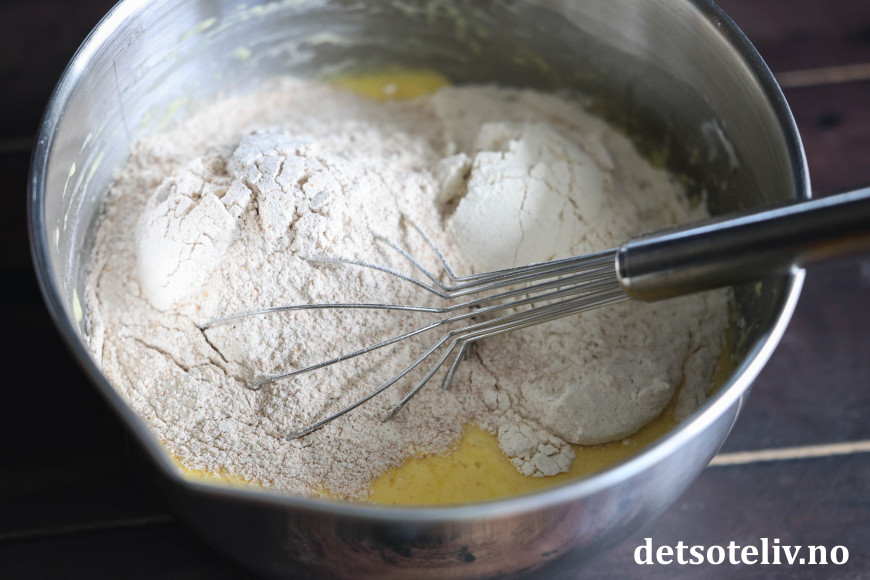 Visp dette raskt sammen. Rør inn bakepulveret og salt. Bland deretter raskt inn hvetemel og fullkornshvetemel til en fast deig. Rør minst mulig i deigen (se tips).