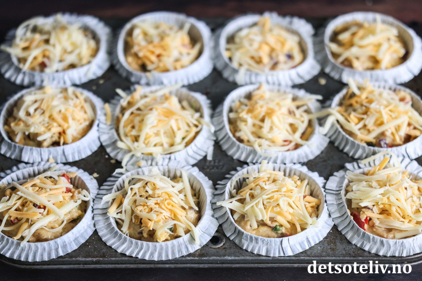 Fordel deigen i muffinsformer som er satt i et muffinsbrett. Topp med mer revet ost.