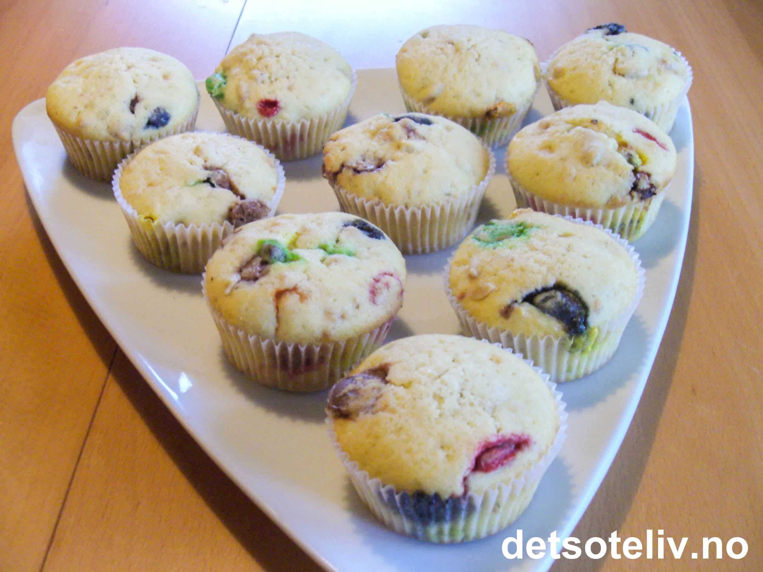 Ha papirformer i muffinsbrett (se tips). Fordel deigen i muffinsformer ved hjelp av to spiseskjeer. Stekes midt i ovnen ved 225°C i 15 min.