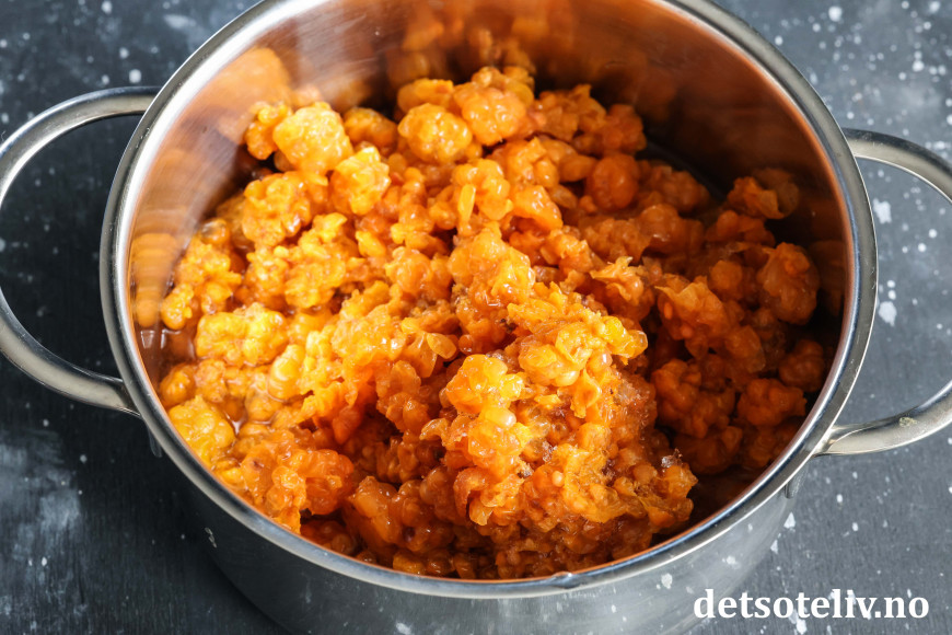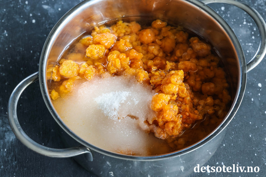 Ha multene i en liten kjele. Tilsett sukker og 1,5 dl vann. La dette småkoke i et par minutter.