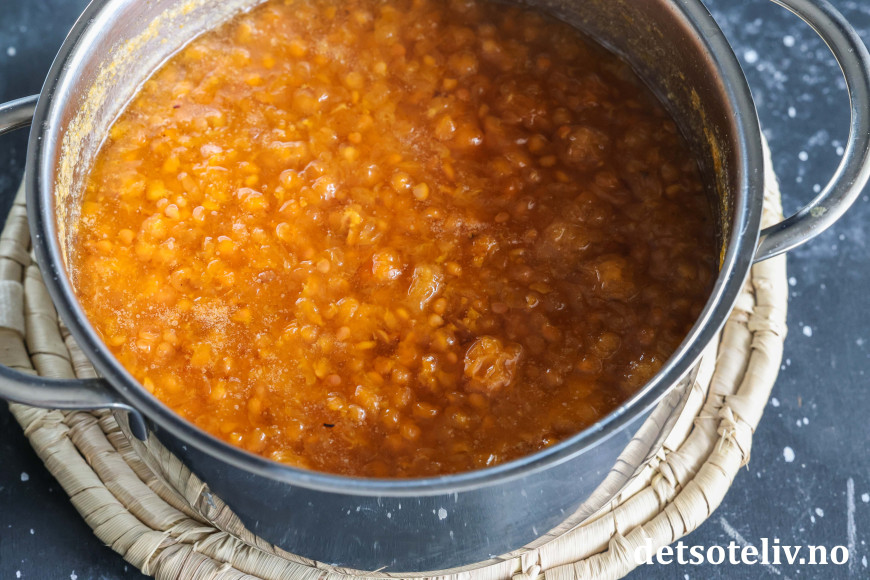 Tilsett sukker og 1,5 dl vann.