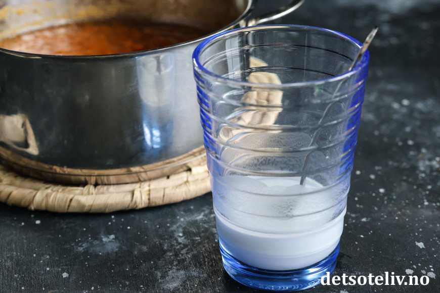 Rør potetmelet sammen med 2 ss kaldt vann slik at potetmelet løser seg opp.