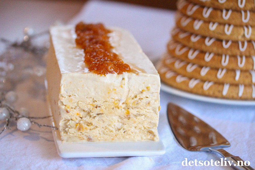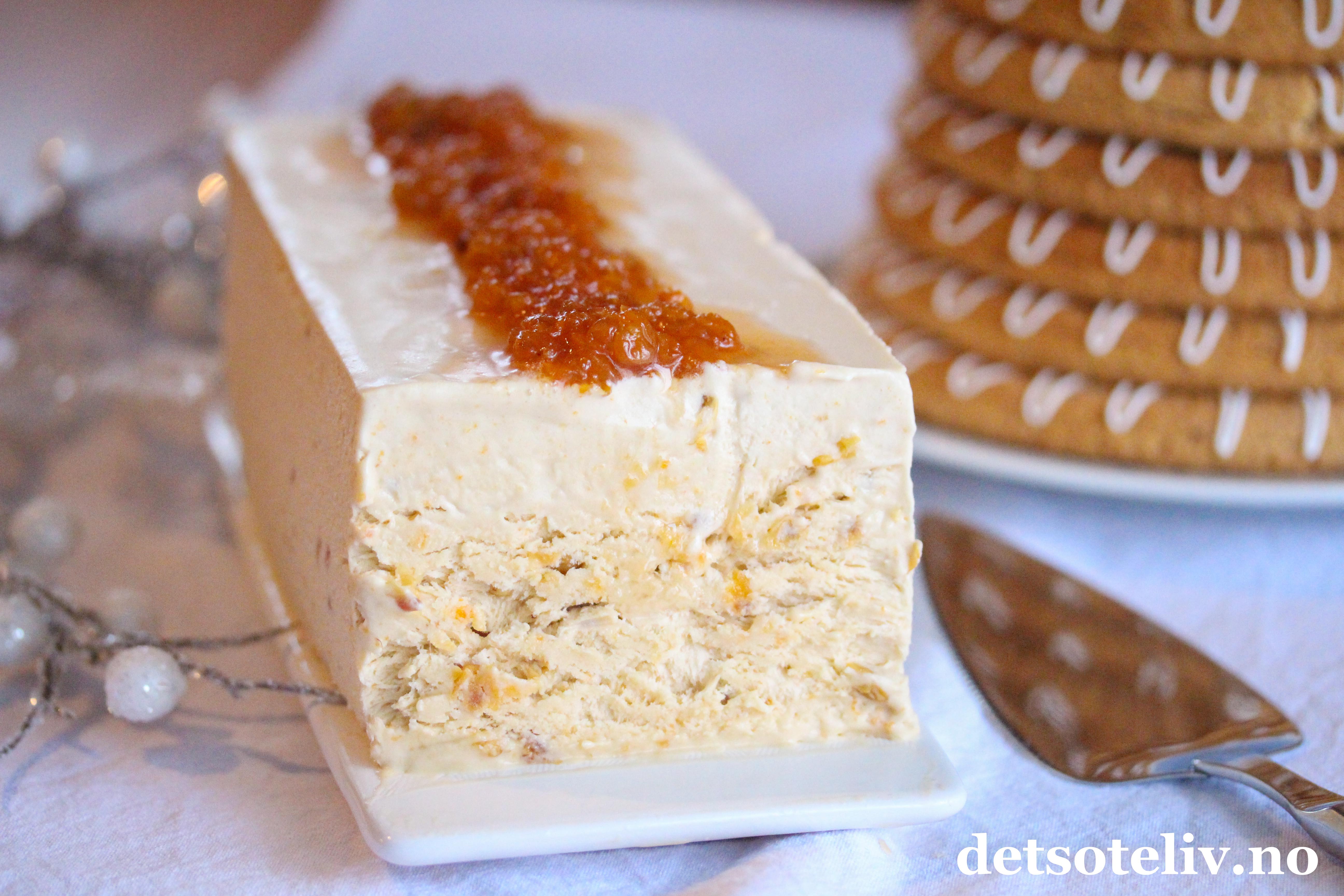 Når isen er avlang som her, er det fint å dele den i skiver ved servering. Bruker du en annen type form eller boks, kan du godt lage iskremkuler med en iskremskje i stedet.