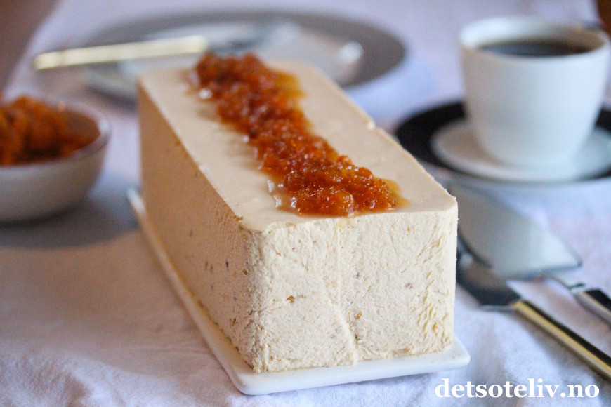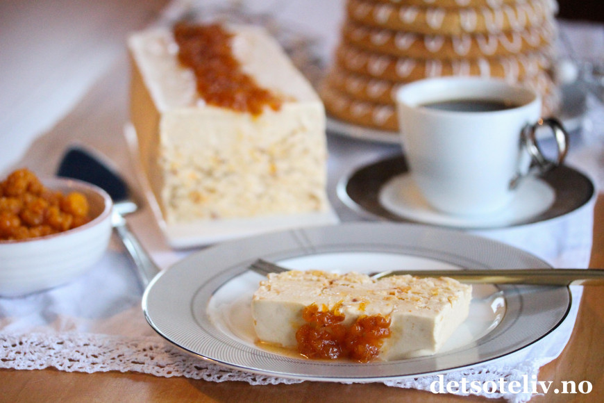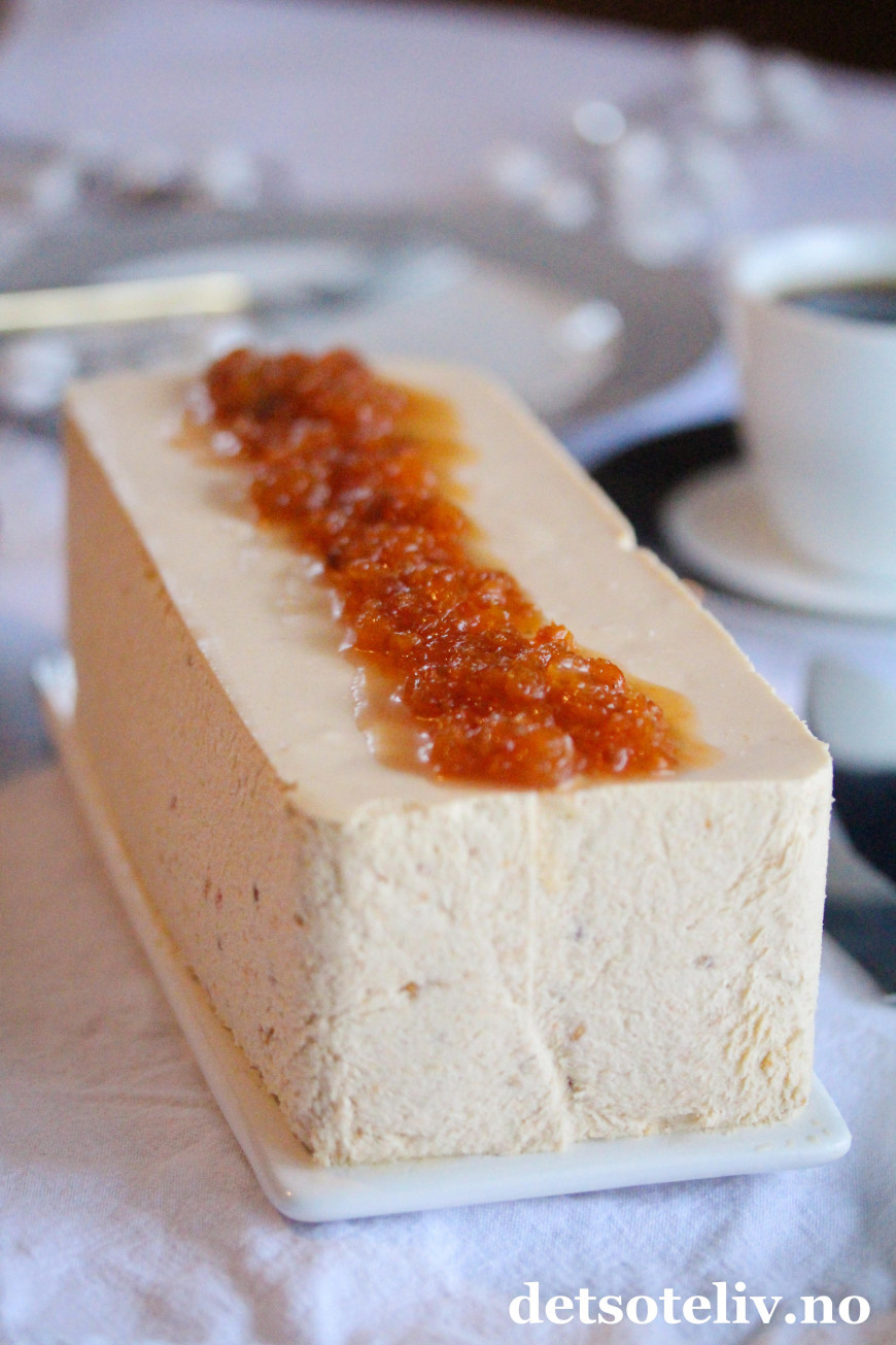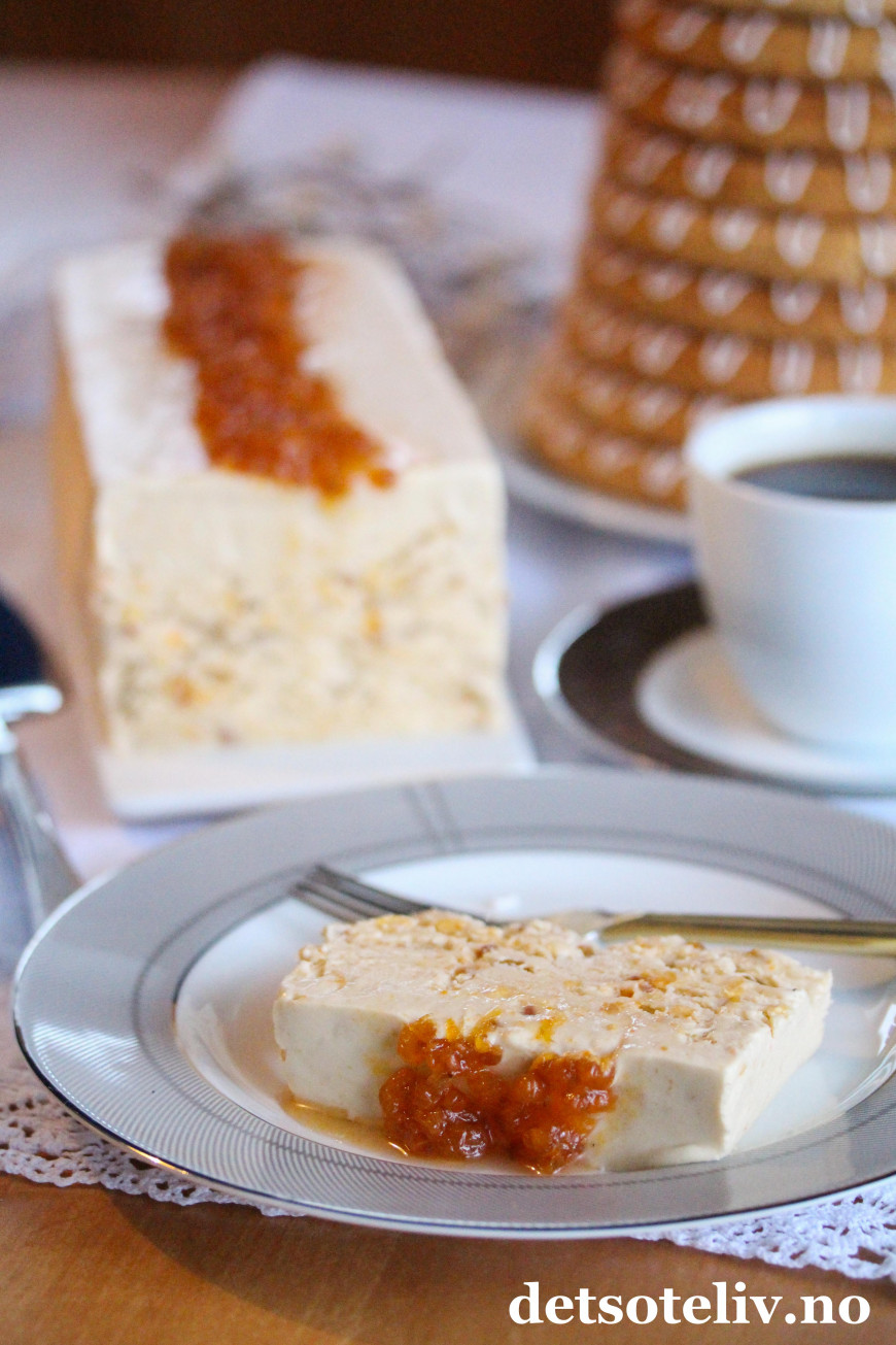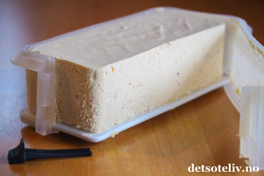 Jeg har her fylt iskremen i en kjempefin avlang silikonform med porselensfat med avtagbar kant, som gjør at iskremen kan serveres som en avlang iskake.