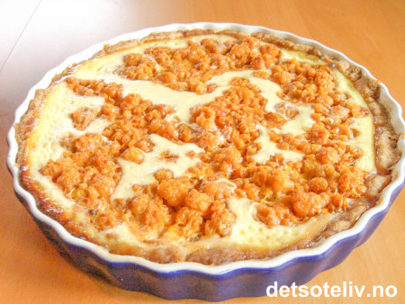 Pisk sammen ingrediensene til rømmefyllet med en stålvisp. Hell dette i paiformen. Multene legges forsiktig i til slutt.