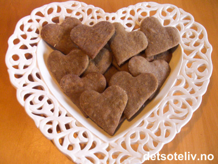 Avkjøl deigen en stund i kjøleskapet. Kjevle ut deigen nokså tynt og stikk ut hjerter. Legg dem på bakepapirdekkede stekeplater. Stekes midt i ovnen ved 200°C i ca 5 min. Avkjøles kakene på rist til de er kalde.