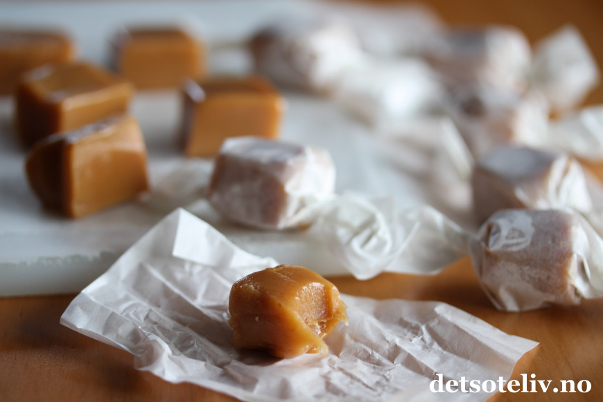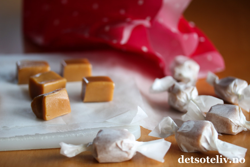 ♥ Merk at karamellene blir harde når de er kalde, men de blir myke igjen om du lar dem stå en liten stund i romtemperatur.