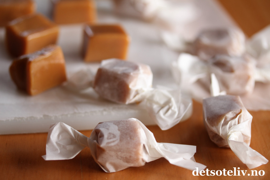 Pakk karamellene inn i matpapir og oppbevar dem kjølig.