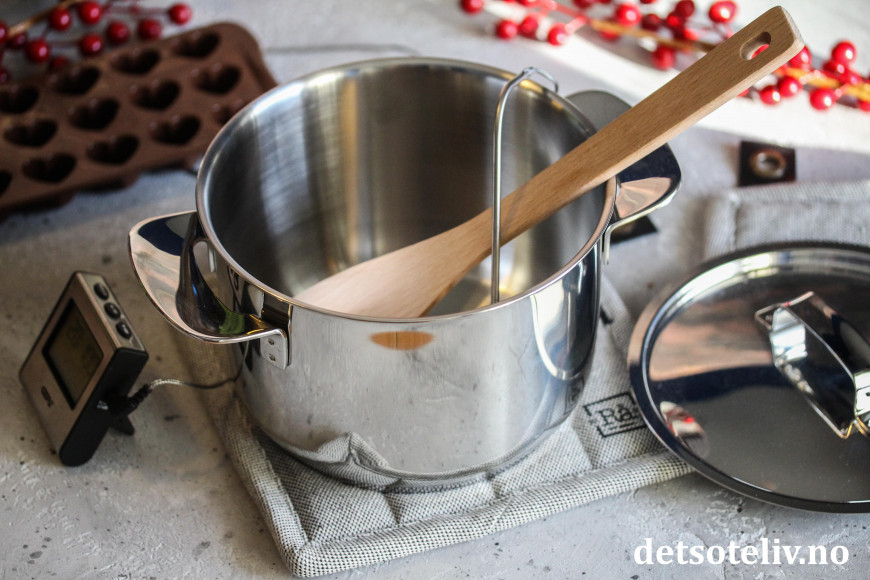♥ Karamellen må koke til den får riktig temperatur, ellers risikerer du at de ikke stivner ved avkjøling. Bruk derfor termometer når du koker karamellen. Det er også lurt å ha et termometer med slange ned i karamellen, som står stødig også mens du rører i karamellen.
