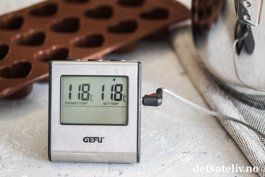 Det er praktisk å bruke termometer med slange når man koker karamell (se link til den type termometer jeg har brukt i nettbutikken til Bakeren og kokken HER).