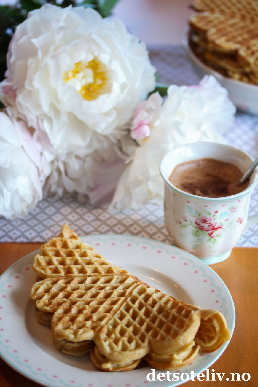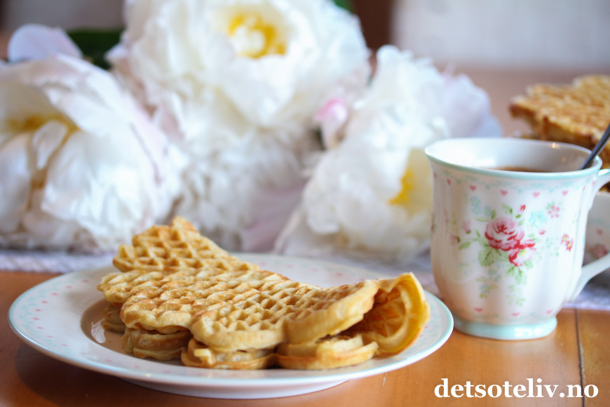 Server vaflene med sukker, rørte bær, syltetøy, rømme, brunost - eller det du måtte like best!