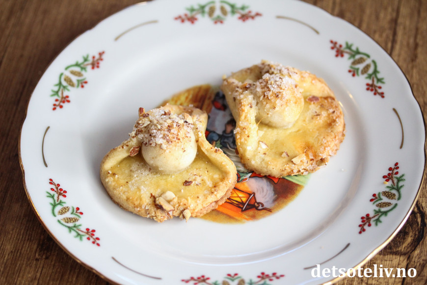 ♥ Det er viktig at du bruker ekte marsipan (lilla rull fra Odense). Vanlig figurmarsipan tåler ikke steking. Hvis du vil, kan du kna inn 1 ss konjakk og litt melis i marsipanen. Noen liker dessuten å farge marsipanfyllet med grønn konditorfarge.