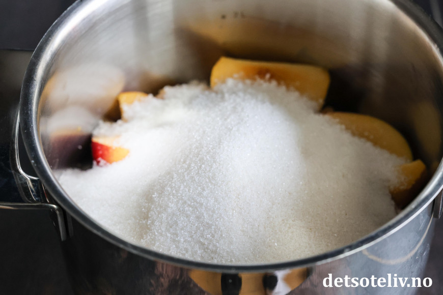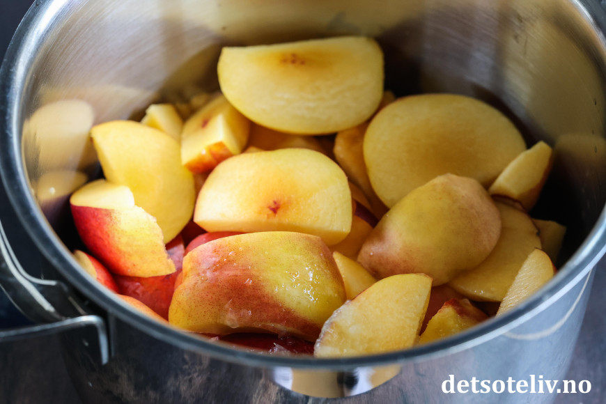 Ha nektarinbåtene og de øvrige ingrediensene i en kjele. Varm opp på middels sterk varme og la syltetøyet småkoke under omrøring til du ser at nektarinbåtene begynner å bli skikkelig bløte.