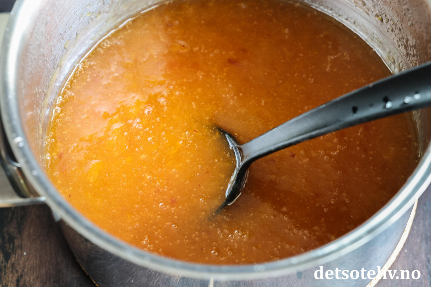 Varm opp på middels sterk varme og la syltetøyet småkoke under omrøring til du ser at nektarinbåtene begynner å bli skikkelig bløte.