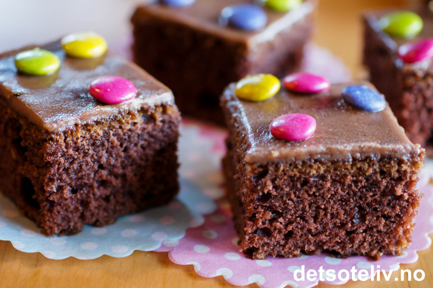 Denne store langpannekaken anbefales til alle barneselskaper (selv om de voksne nok også vil kunne ha lyst til å forsyne seg her.. 😉 )!