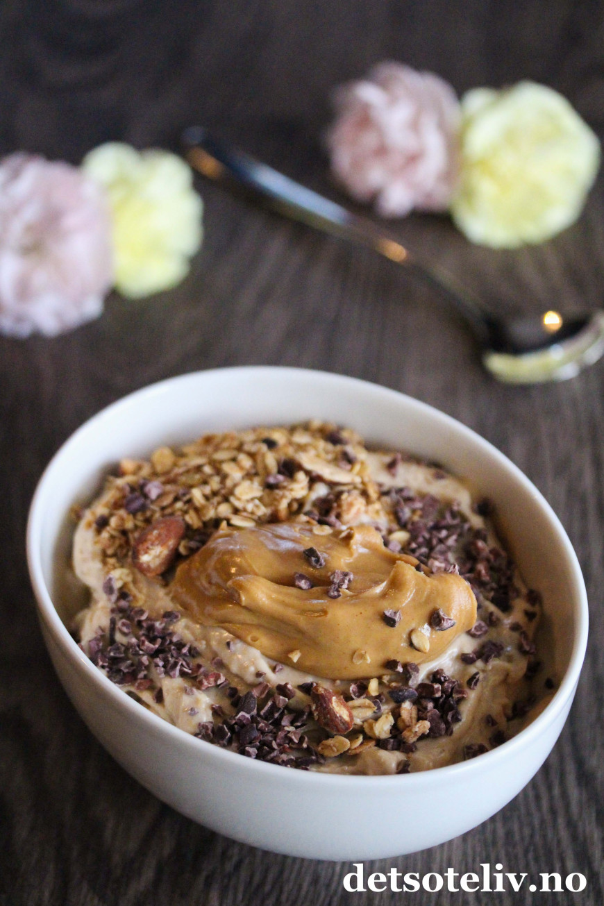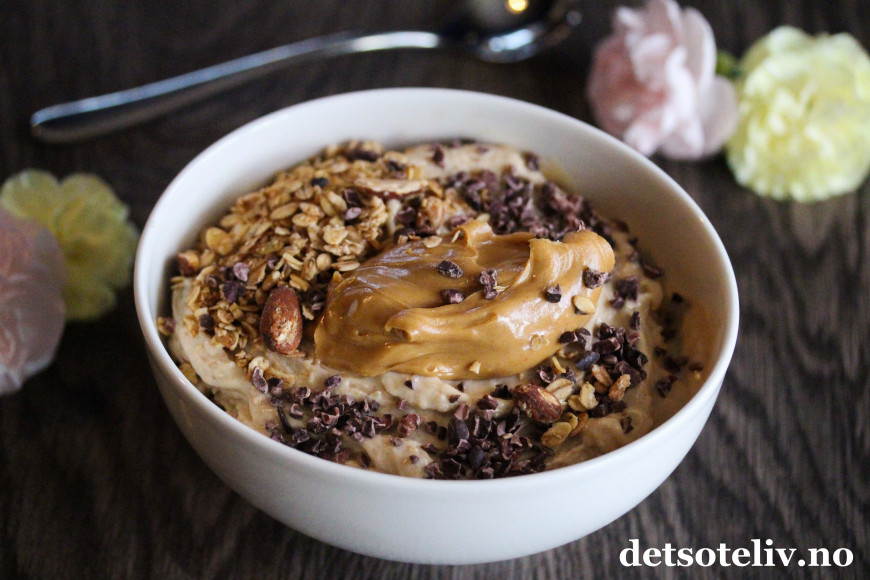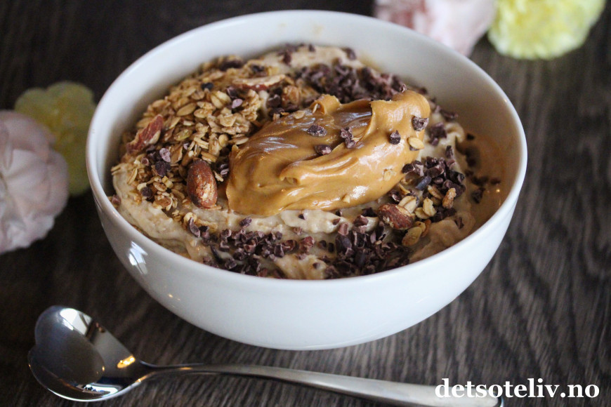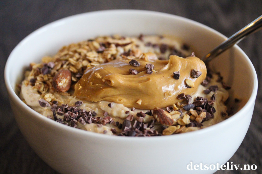 Topp med det du liker. Jeg tok denne gangen granola, noen ekstra mandler, et godt dryss med kakaonibs og så en real klatt med kremete peanøttsmør.