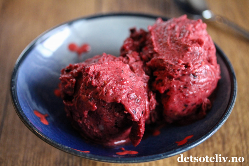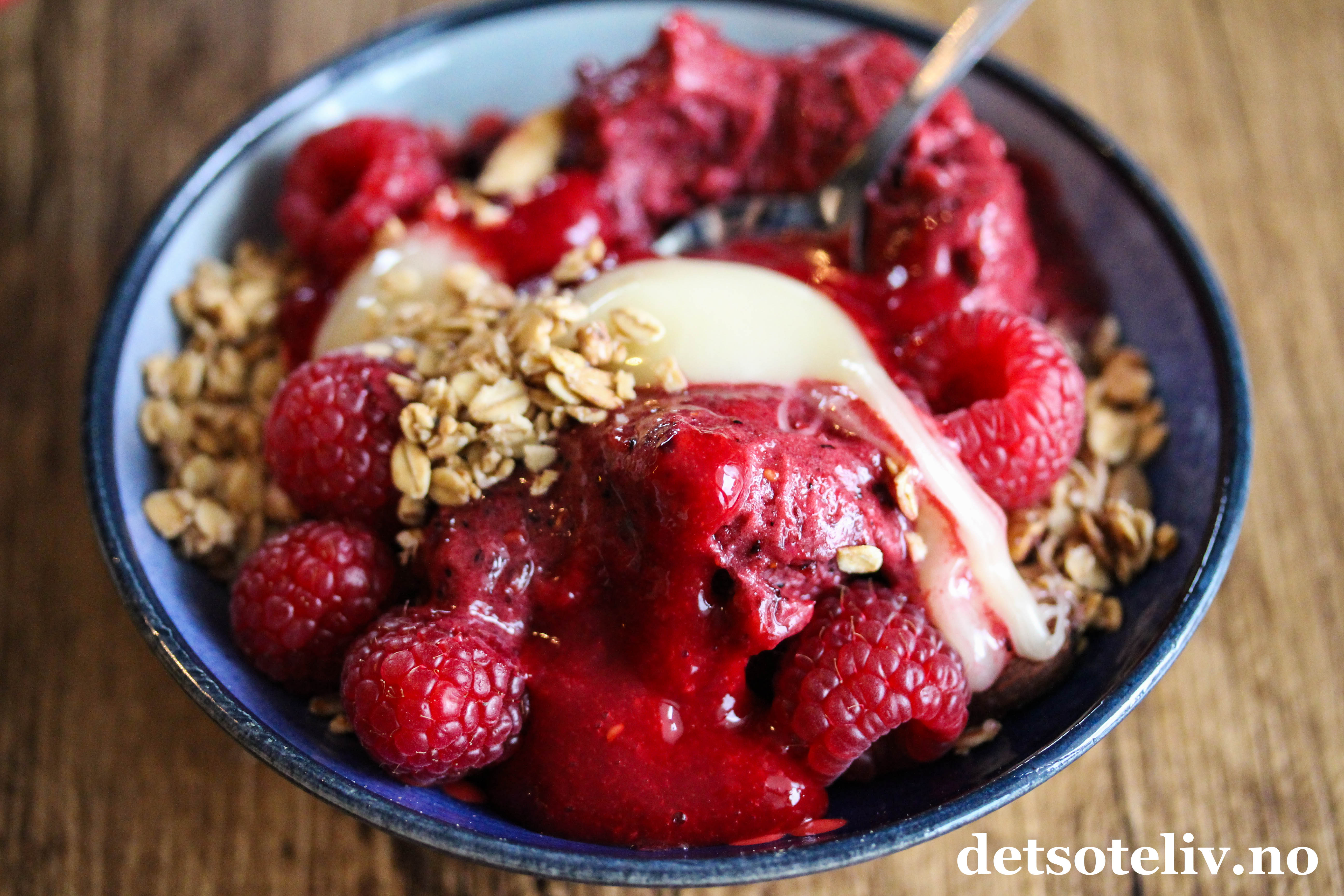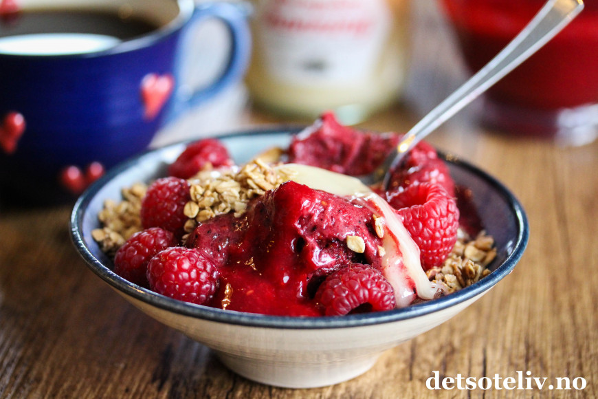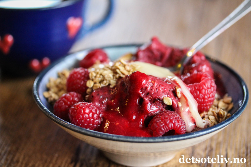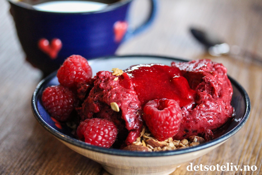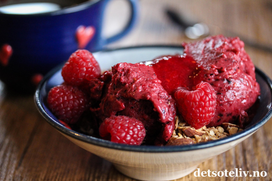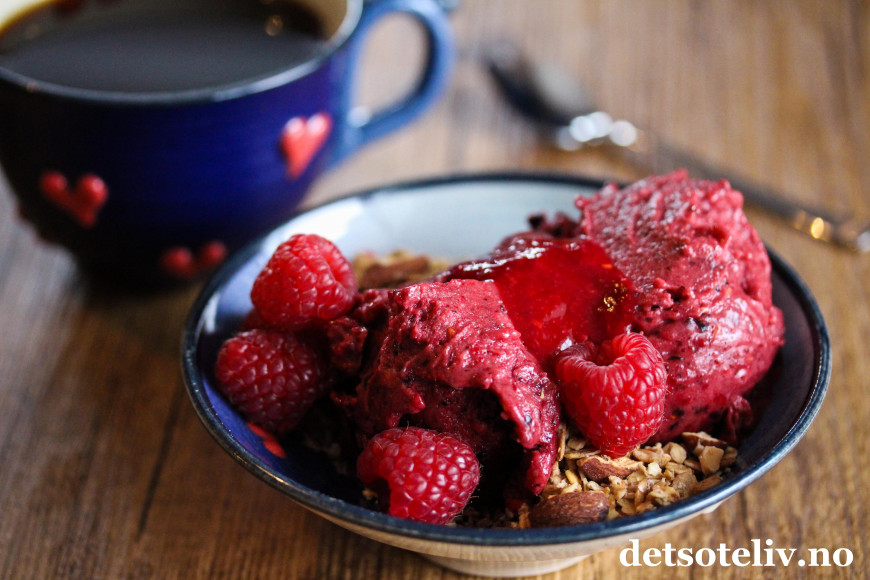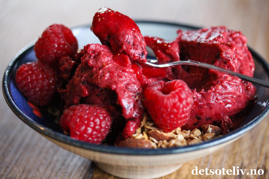 Det sier seg selv at man kan variere i det uendelige. Her har jeg laget en Nice Cream med skogsbærsmak, og så toppet skålen med en god granola, friske bringebær, hjemmelaget bringebærsaus og bringebærhonning.