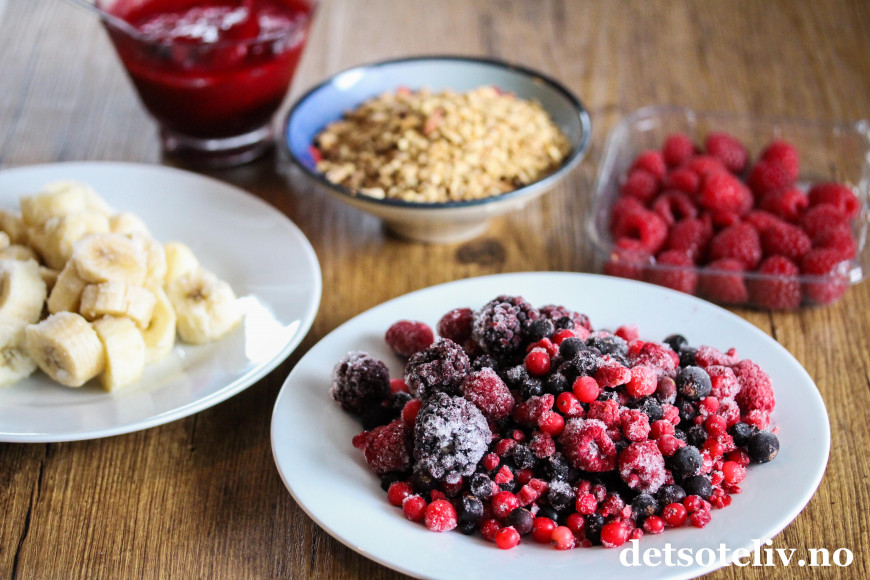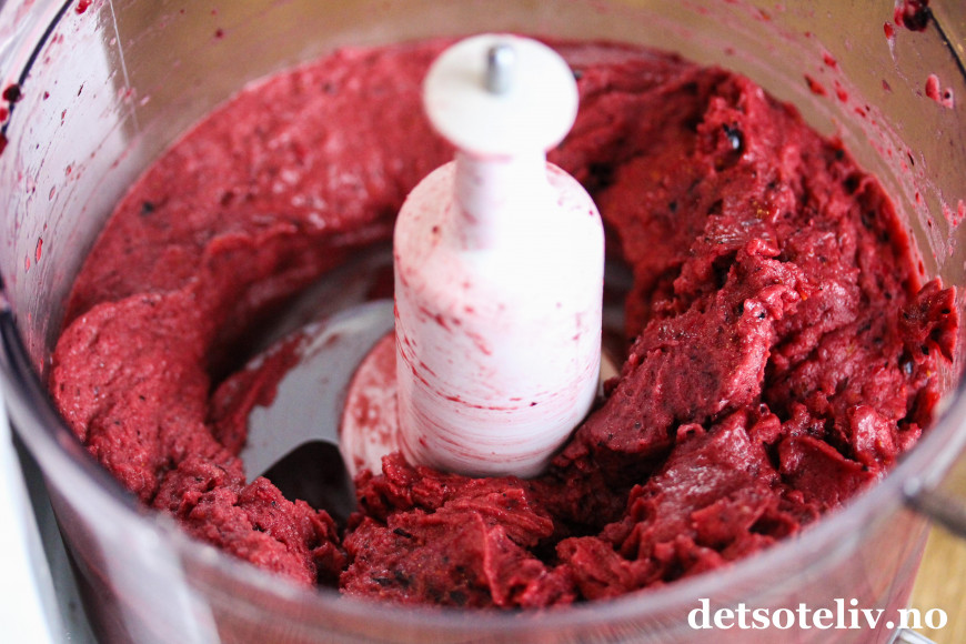 Ha frosne bananbiter og frossen skogsbærblanding i en food processor med hakkekniv. Kjør blandingen sammen. I starten vil den virke kornete og tørr, men bare fortsett å kjøre blandingen sammen enda en stund til. Stans food processoren innimellom for å skrape ned det som samler seg i kantene, slik at alt blir jevnt most. Til slutt vil konsistensen blir som en jevn mykis.
