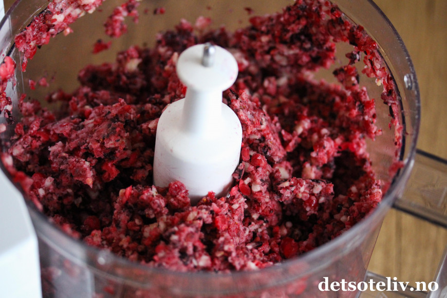 Stans food processoren innimellom for å skrape ned det som samler seg i kantene, slik at alt blir jevnt most. Til slutt vil konsistensen blir som en jevn mykis.