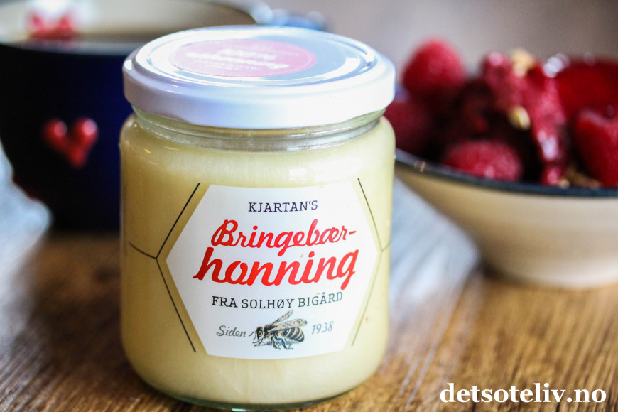 Jeg synes det blir ekstra godt med en skje god honning på toppen sammen med granolaen. Her fikk jeg tak i rå bringebærhonning, som har alle gode næringsstoffene i behold (se tips).