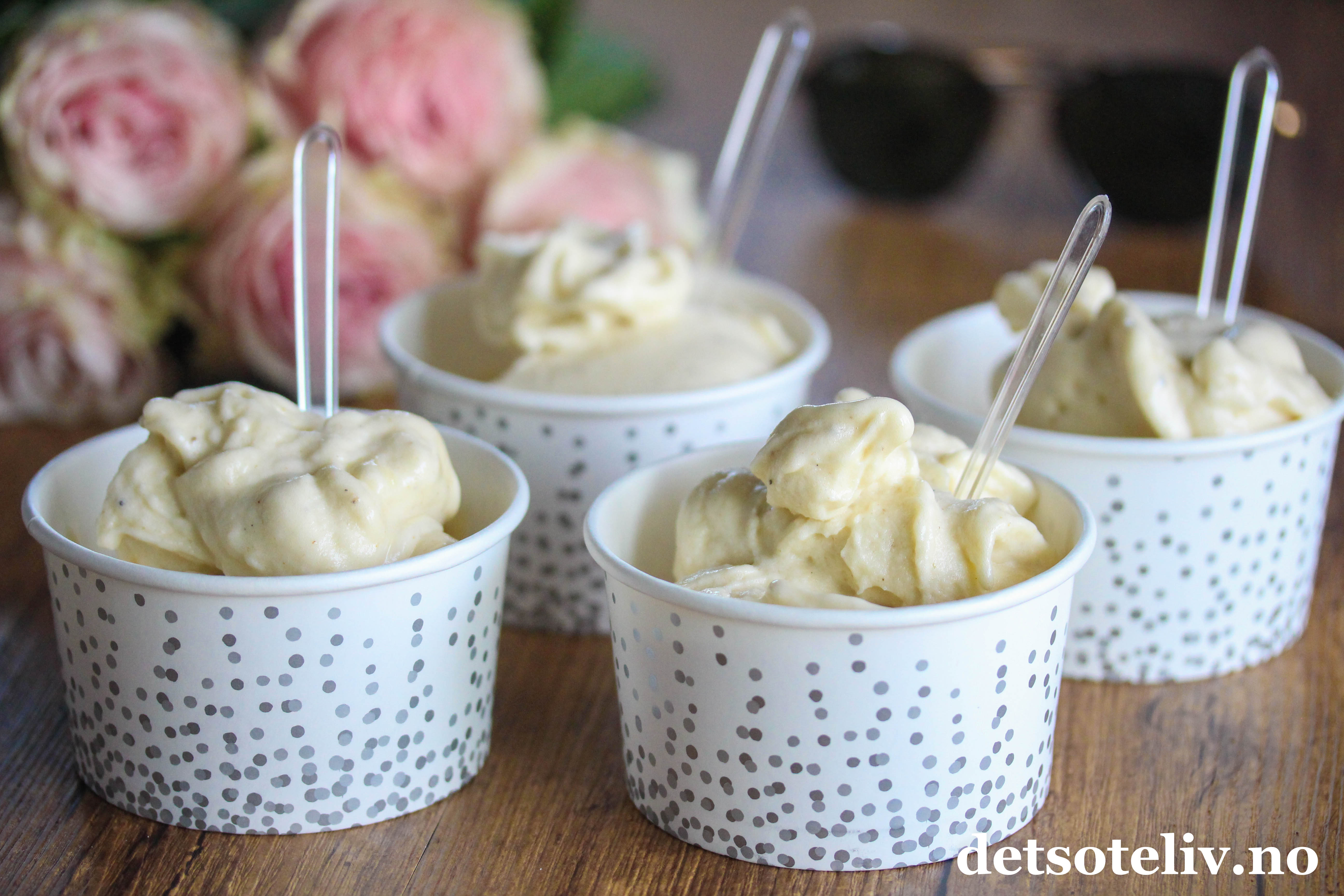 Denne isen inneholder bare frukt, og er derfor naturlig sukkerfri, fettfri og vegansk. Nice Cream har blitt veldig populært og kan smaksettes på ulikt vis. Jeg har testet ut flere varianter, men nå i dag tenkte jeg først å vise dere en grunnoppskrift som kun inneholder bananer og vanilje.