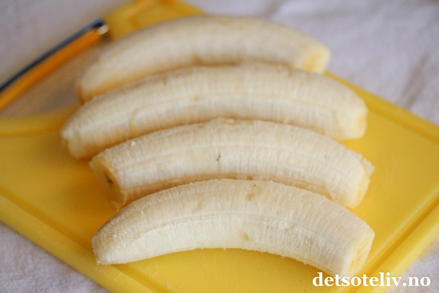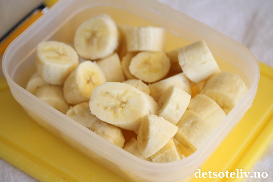 Du bør dele opp bananene før du fryser dem, for bitene er lettere å mose enn hele bananer når de er frosne.