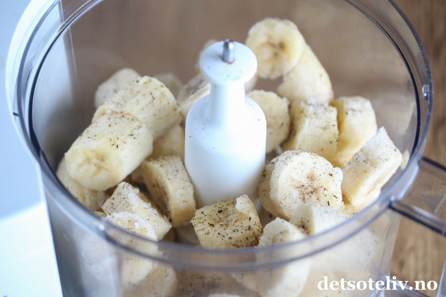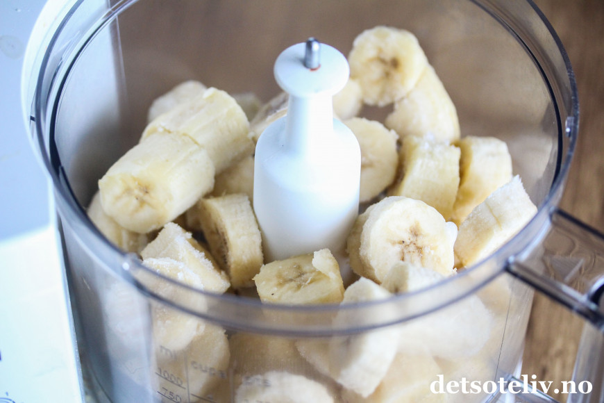 Bananene må i forkant deles i biter og fryses ned over natten så de er helt frosne.