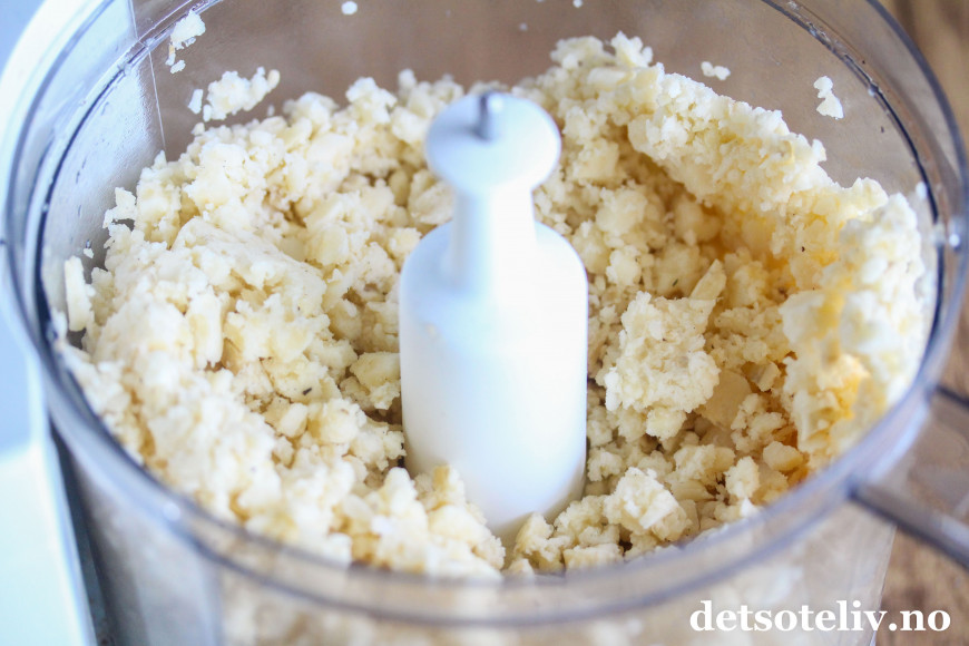 Kjør food processoren på full styrke. Du vil først se at bananene deles opp og blir som tørre, grovkornete biter.