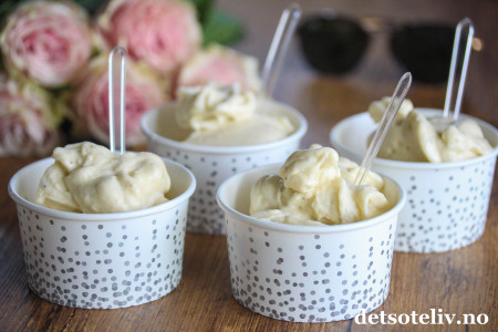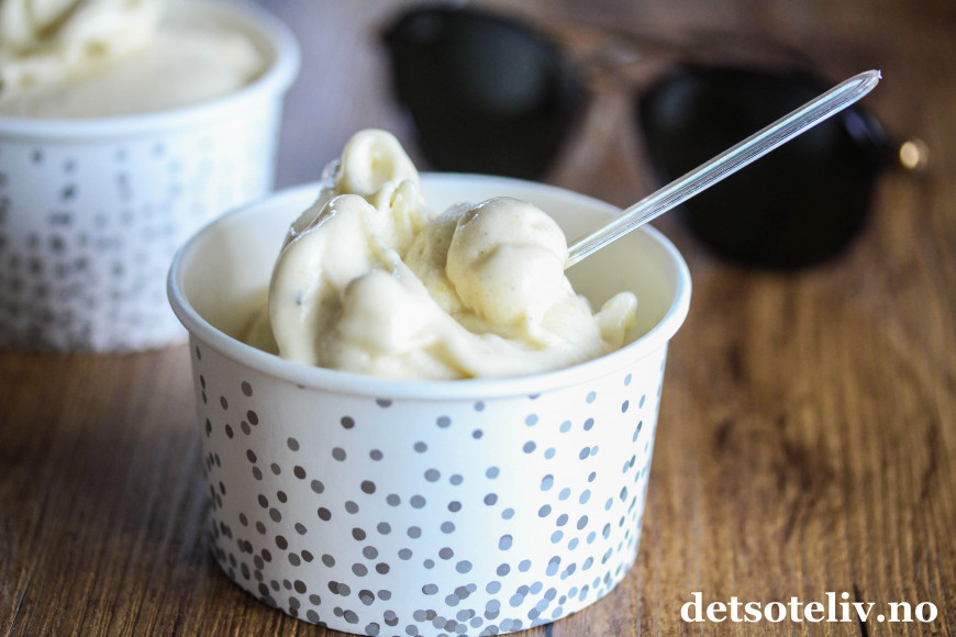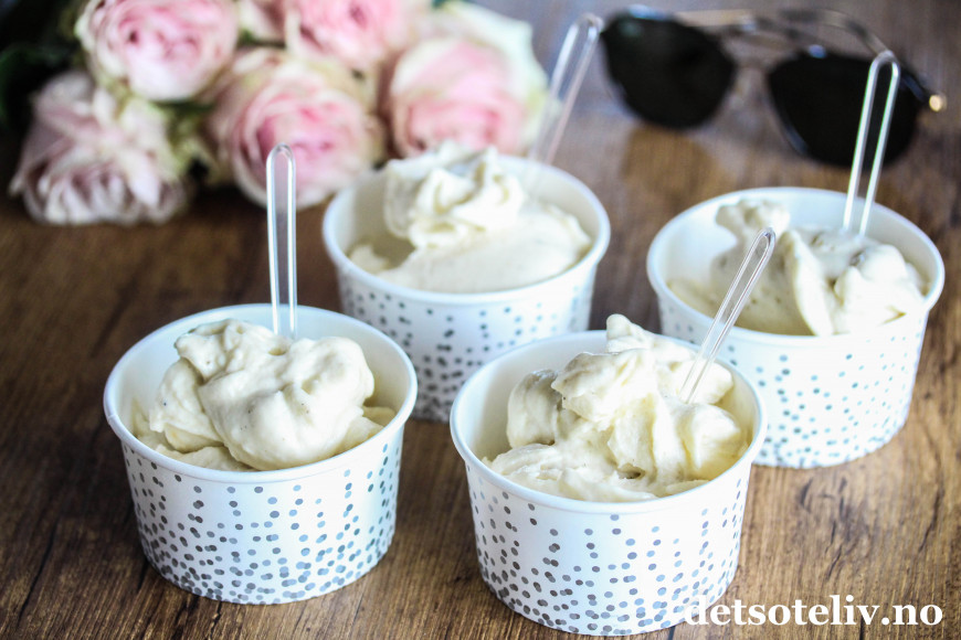 ♥ Isen fra food processoren er nokså myk (nesten som softis). Hvis du ønsker fastere iskrem som du kan lage kuler av, må du ha mykisen i en plastbeholder og fryse ned i et par timer.