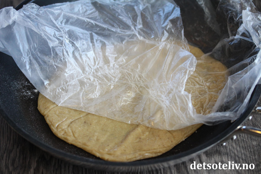 Varm opp en stekepanne på middels varme og legg deigsirkelen i tørr panne. Det går lett å flytte deigsirkelen over i stekepannen ved å løfte plasten med deigsirkelen over på stekepannen og så dra av plasten.