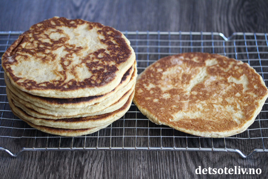 Ha ekstra mel på bakebordet. Del deigen i 10 like store emner. Klipp opp en liten plastpose og bruk plasten som underlag i tillegg til ekstra hvetemel på hendene. Klapp hvert emne utover på plasten til en sirkel på størrelse med en asjett (ca. 18 cm i diameter). Varm opp en stekepanne på middels varme og legg deigsirkelen i tørr panne. Det går lett å flytte deigsirkelen over i stekepannen ved å løfte plasten med deigsirkelen over på stekepannen og så dra av plasten.