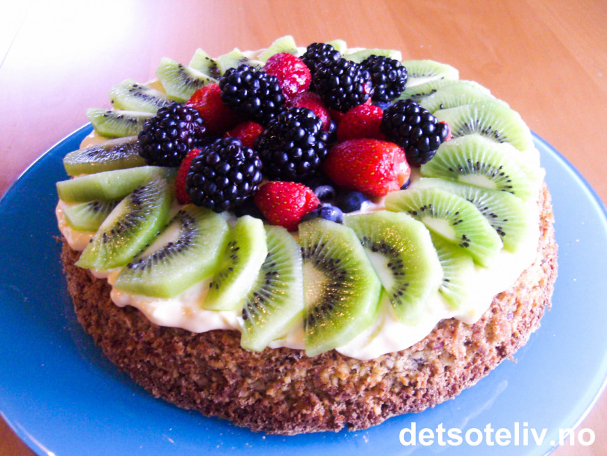 Kaken på bildet er dekket med kiwi, jordbær, blåbær og bjørnebær. Du kan bruke akkurat det du måtte ønske til pynt. Godt avrent hermetisk frukt kan også brukes.