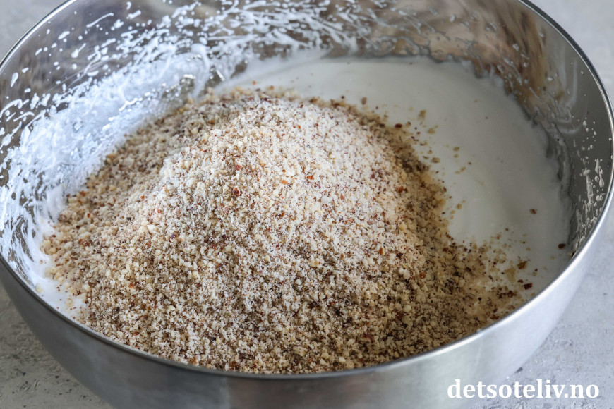 Mal hasselnøttene og vend disse deretter inn i marengsen.