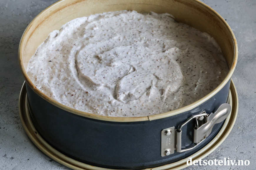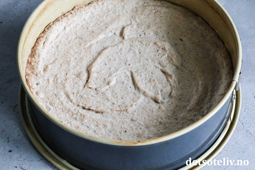 Ha nøttemarengsen i en rund form (24 cm i diameter) med bakepapir i bunnen. Springformen bør ha nokså høye kanter.