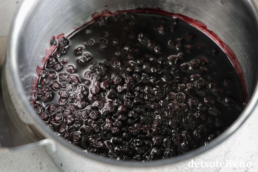 Ha blåbærene i en kjele og varm opp på middels varme (det går fint å bruke frosne blåbær).