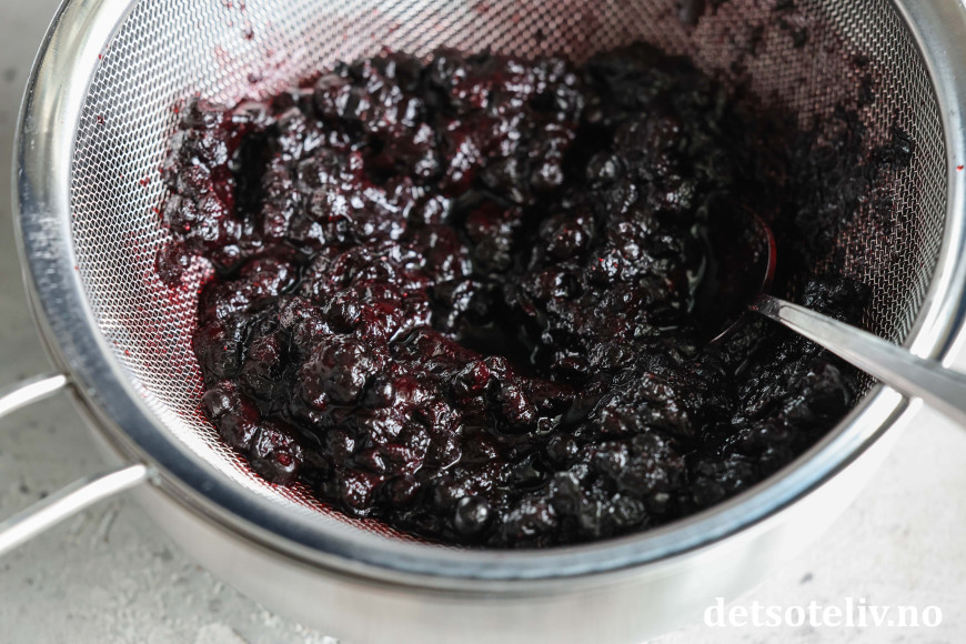 Sil blåbærsausen over i en bolle. Press godt med baksiden av en skje slik at du får med all den gode blåbærsaften. Ha blåbærsaften tilbake i kjelen og varm opp forsiktig.